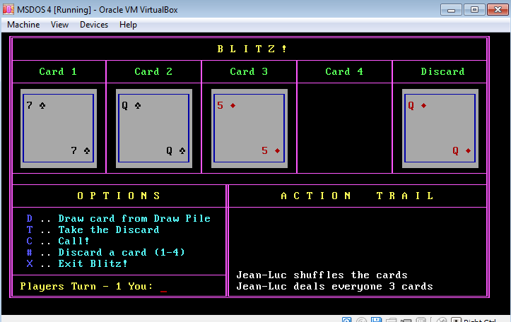 This was a simple card game called Blitz that my friend showed me how to play … back when I was in high school. The rules were so simple, and it was pretty fun, so I thought it would make for a good little programming project. I never did figure out how to make the computer players make good choices though.